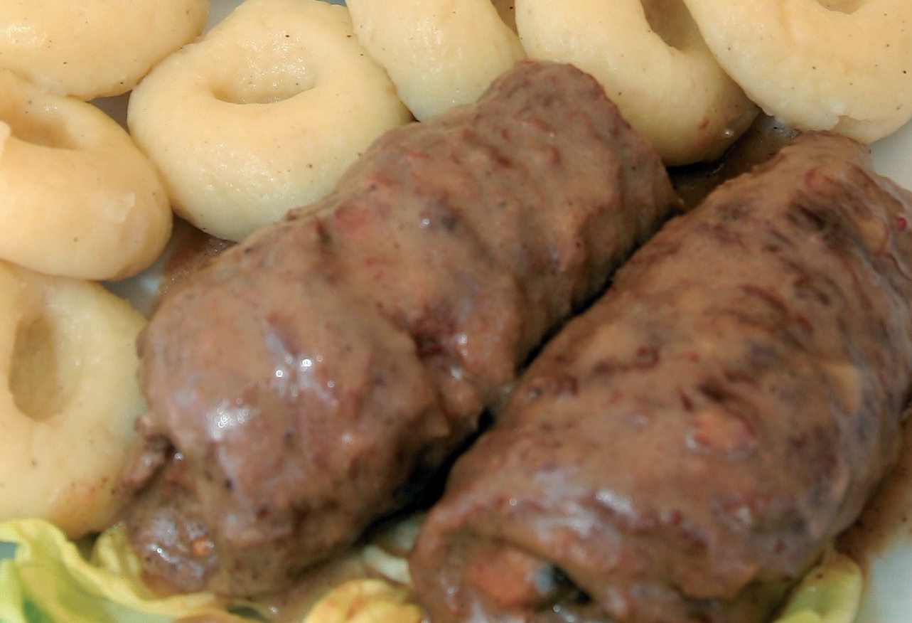 Zrazy podajemy z kaszą lub kluskami i modrą kapustą.