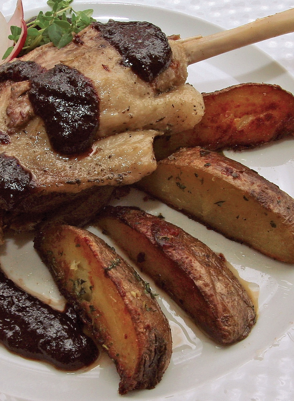 Udko z gęsi Świętego Marcina na sosie śliwkowym w asyście surówki z selera o aromacie krupnioka pszczyńskiego z ziemniakami ziołowymi