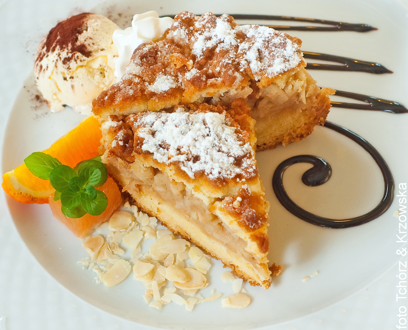 Z mąki, masła, jajek, proszku do pieczenia i cukru waniliowego zarabiamy ciasto, po czym schładzamy je ok. pół godziny w lodówce. Po schłodzeniu dzielimy je na dwie części, rozwałkowujemy i wykładamy na wysmarowaną i obsypaną bułką tartą formę. Nakładamy masę z prażonych jabłek i przykrywamy drugą partią rozwałkowanego ciasta. Pieczemy w temperaturze 180°C przez około 60 min. Sos sporządzamy, łącząc wszystkie składniki, a następnie redukując je na małym ogniu aż do zgęstnienia. Jabłecznik przed podaniem obsypujemy cukrem pudrem i polewamy sosem.