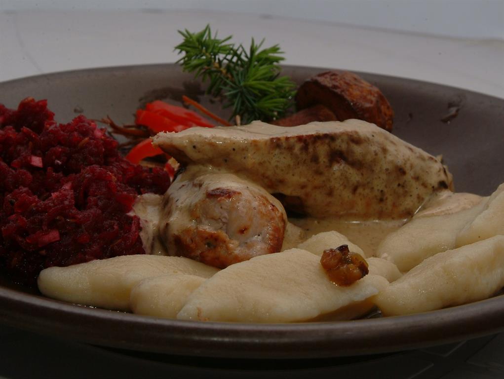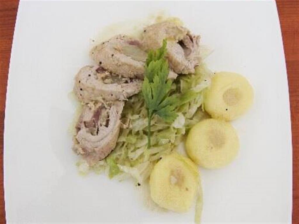 Tradycyjna śląska rolada z mięsa wołowego z nadzieniem z kiełbasy i ogórków kiszonych, serwowana z kluskami śląskimi oraz modrą kapustą.