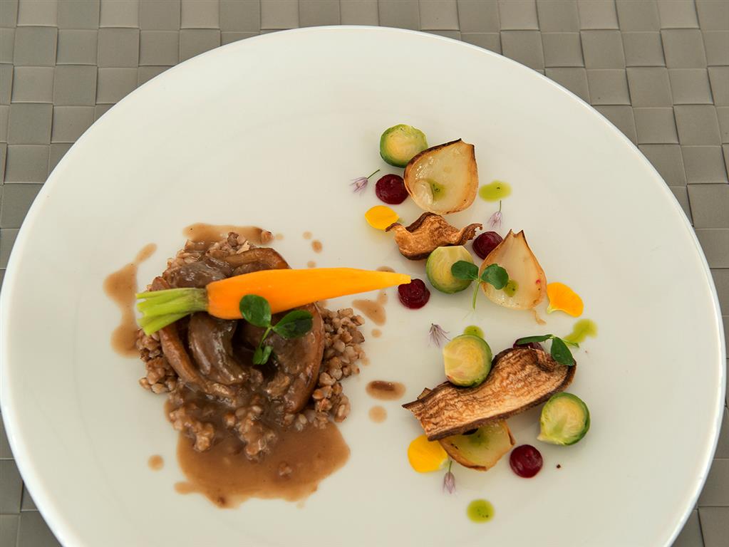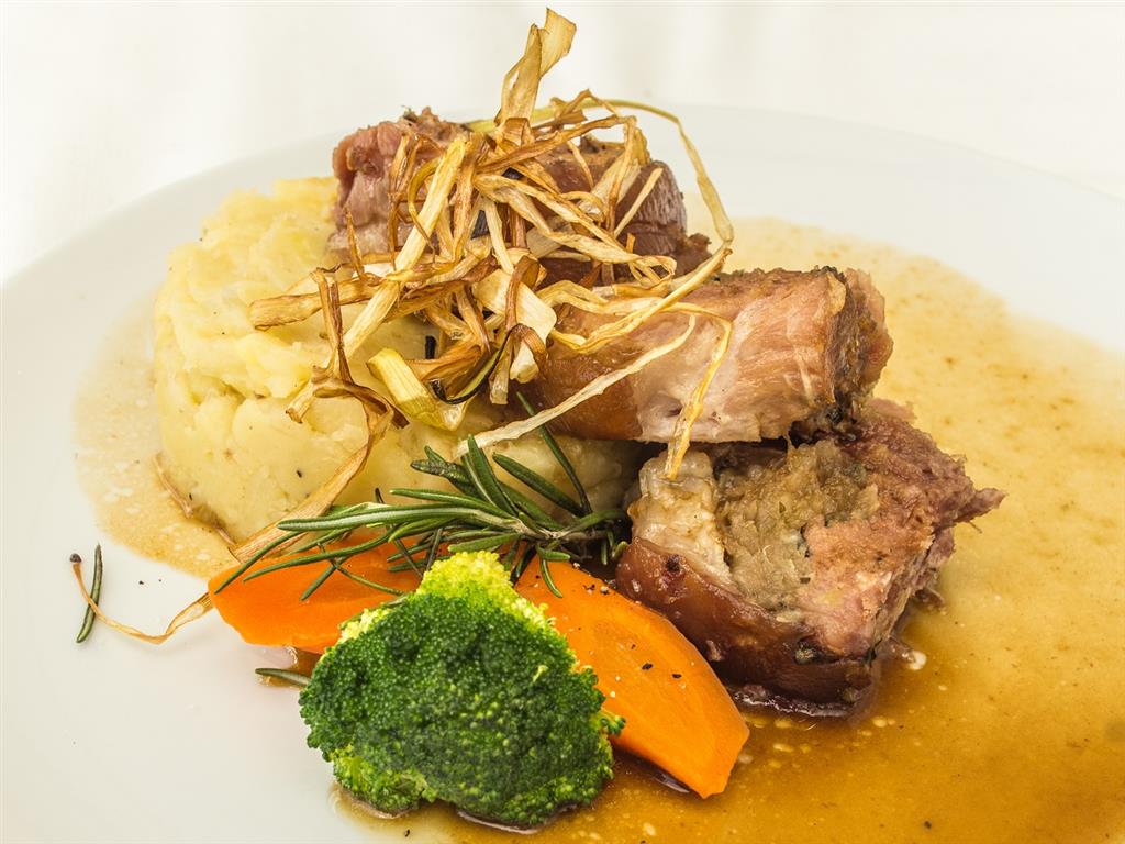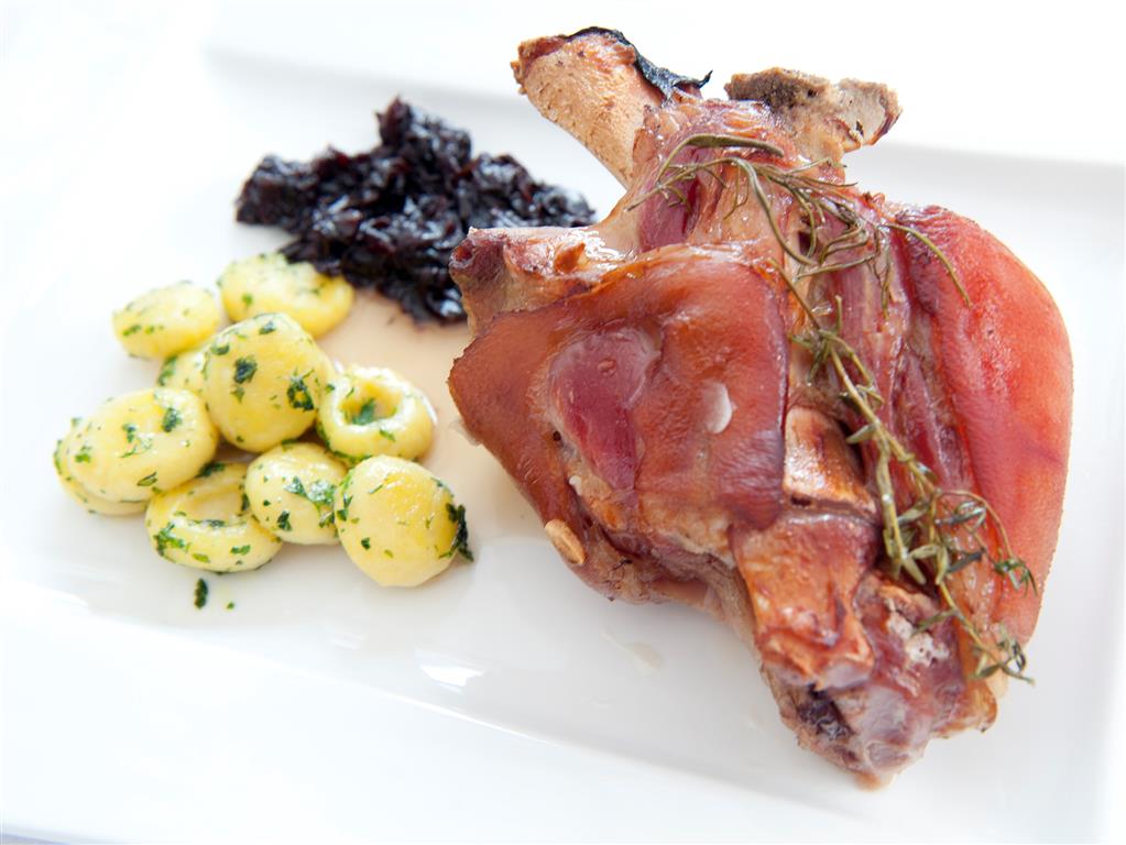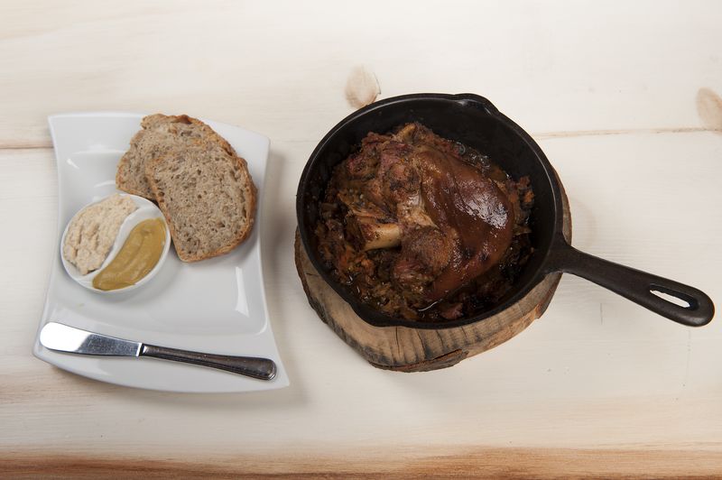 Golonkę doprawiamy czosnkiem, faszerujemy kapustą kiszoną, rolujemy związujemy dratwą i zostawiamy w chłodni na 24 godz. Następnie gotujemy confit 12 godz. w temp. 92oC, wychładzamy. Robimy pańczkraut z kiszonej kapusty i purée ziemniaczanego, przyrządzamy sos piwny z warzywami.