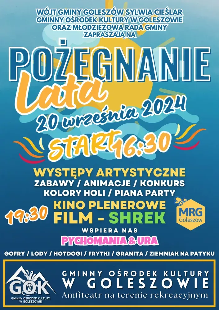Wójt Gminy Goleszów, Gminny Ośrodek Kultury w Goleszowie oraz Młodzieżowa Rada Gminy Goleszów zapraszają na pożegnanie lata w gminie Goleszów! W piątek, 20 września na terenach rekreacyjnych za goleszowskim ośrodkiem kultury odbędą się pokazy artystyczne, zabawy, konkursy i animacje, kolory holi oraz piana party! Punktem kulminacyjnym imprezy będzie kino plenerowe w goleszowskim amfiteatrze, w ramach którego o godz. 19.30 radni juniorzy zapraszają na projekcję pierwszej części kultowego filmu animowanego "Shrek". W trakcie imprezy nie zabraknie także pysznych przekąsek, w tym gofrów, lodów, hot-dogów, frytek, granity oraz ziemniaków na patyku!![]()