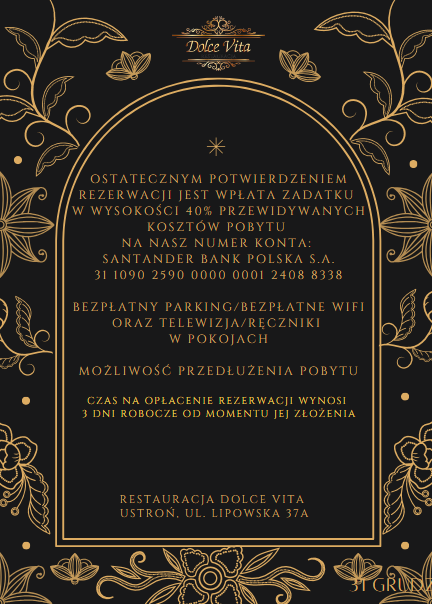 Zapraszamy na niezapomniany pobyt sylwestrowy w Hotelu & Restauracji Dolce Vita w Ustroniu!