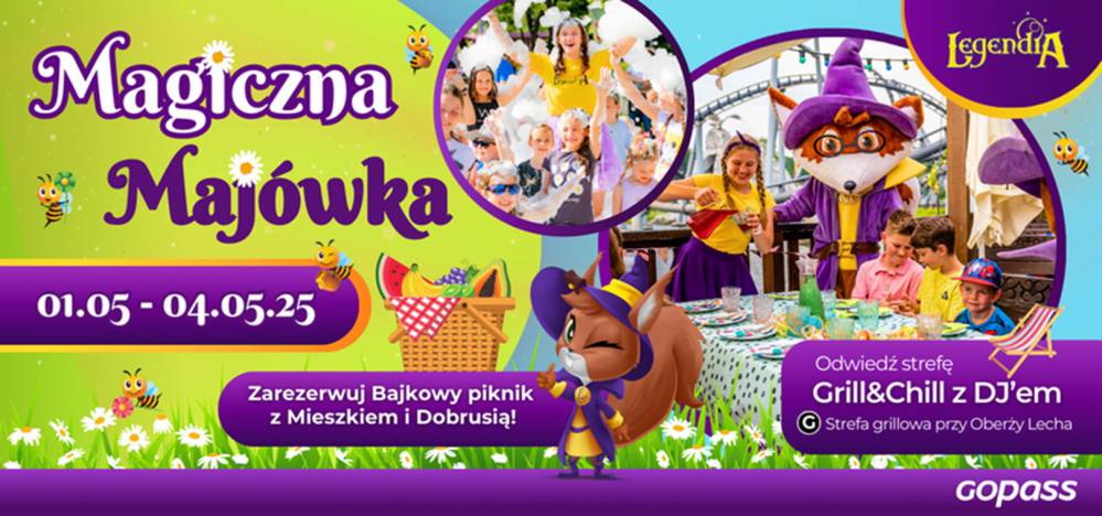 W dniach 1-4 maja odbędzie się Magiczna Majówka w Legendii. Będą animacje ze skrzatami, piana party, grill&chill czy Bajkowy piknik z Mieszkiem i Dobrusią. W bogatym programie, każde dziecko (i opiekun) znajdzie mnóstwo atrakcji. Jednodniowy bilet w tym okresie, dla osoby dorosłej i juniora (dziecko w wieku 12-17) kosztuje 139 złotych. Dla dzieci w wieku 3-11 119 złotych. Dla seniorów 99 złotych. Warto sprawdzić także możliwości i kombinacje biletów rodzinnych.