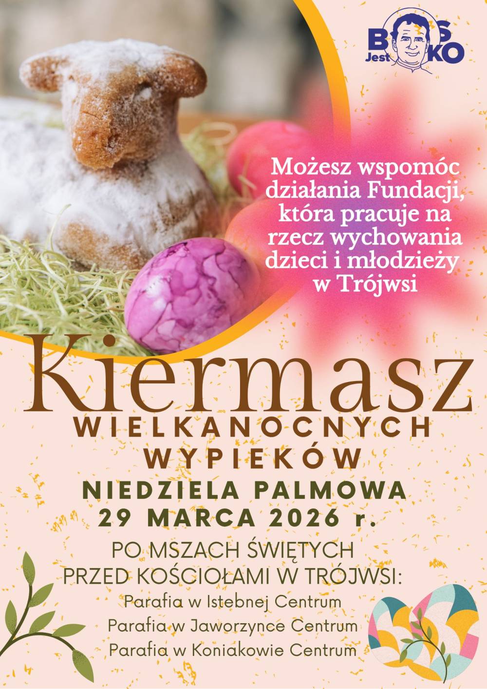 W Niedzielę Palmową w trzech parafiach w Gminie Istebna (Dobrego Pasterza w Istebnej, śś. Piotra i Pawła w Jaworzynce oraz św. Bartłomieja w Koniakowie) odbędzie się kiermasz wielkanocnych wypieków. Będą puszyste, biszkoptowe baranki oraz pyszne domowe babki. Kiermasz rozpocznie się od godziny 7.00 i potrwa do ostatniej sztuki. Dochód z kiermaszu zostanie przeznaczony na dalsze działania Fundacji Jest Bosko skierowane do dzieci i młodzieży w Trójwsi. Zapraszamy!