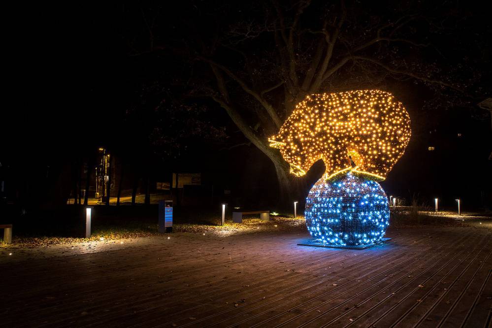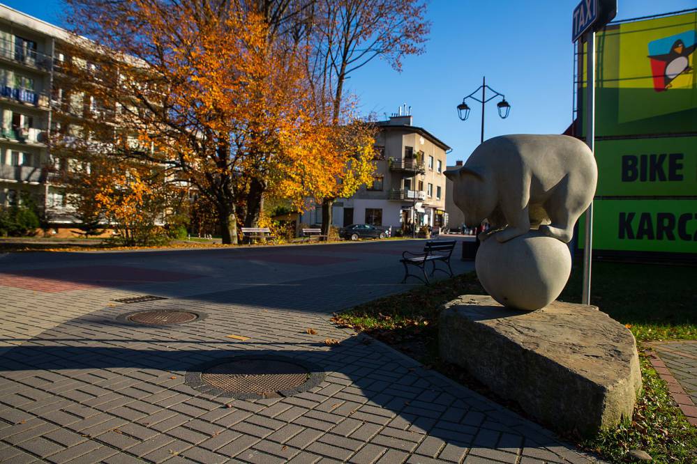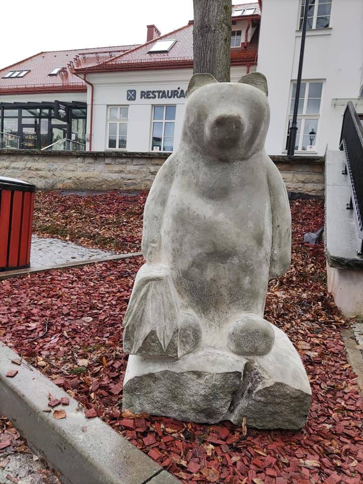 Kamienny miś na kuli powstał w 2017 r. i jest wiernym odwzorowaniem figury zlokalizowanej w Parku im. St. Kopczyńskiego. Rzeźba znajduje się w odległości zaledwie 280 m od wiślańskiego rynku - Placu Bogumiła Hoffa.