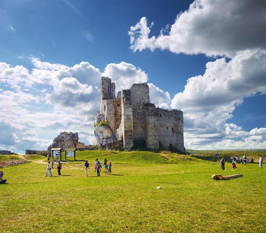 Niezwykle efektowne ruiny mirowskiej twierdzy są obecnie zabezpieczane i wkrótce znów będą dostępne dla zwiedzających. Tymczasem warto odwiedzić zamkowe błonia (wstęp kosztuje 7 zł), gdyż właśnie tutaj rozpoczyna się pętla wokół Mirowskiej Grzędy. Z kilku punktów widokowych rozciągają się stąd fantastyczne widoki na oba zamki oraz typowy dla tego regionu krajobraz.