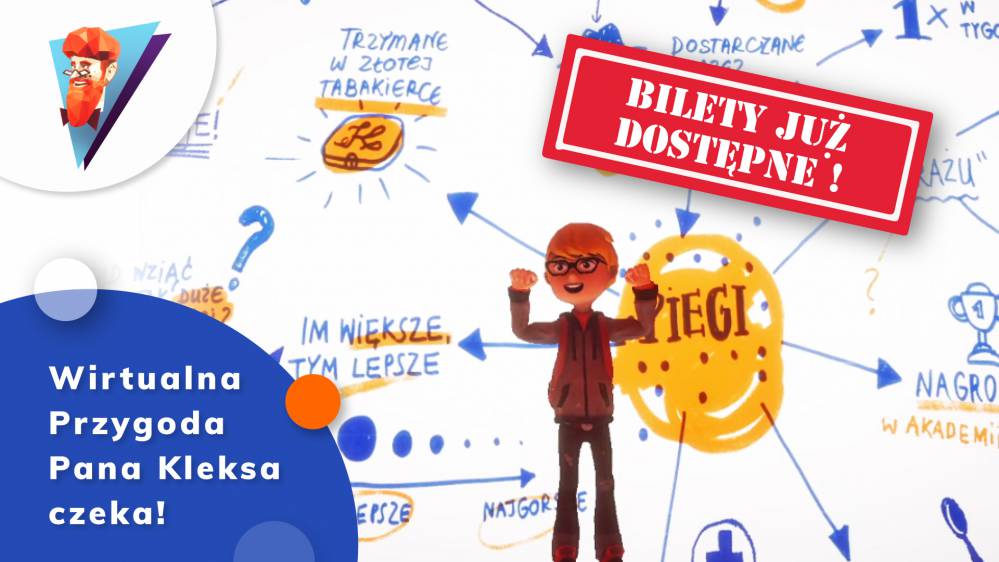 Zwieńczeniem przeprowadzonych z sukcesem spotkań, akcji i eventów online stała się Wirtualna Przygoda Pana Kleksa. To pierwsze tego typu przedsięwzięcie w Polsce. Decydując się na zakup biletu otrzymujemy aplikację do pobrania oraz dostęp do 60 minut zabawy na żywo w towarzystwie bajkowego przewodnika.