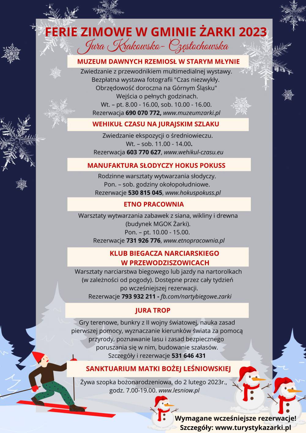 Przygoda, zabawa i edukacja to turystyczna oferta gminy Żarki. Idealna na zimę, gdyż większość atrakcji jest pod dachem. Zapraszamy na kreatywne warsztaty, podróże w czasie i zimowe szaleństwo!
