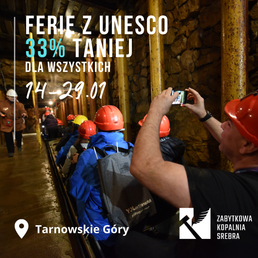 Od 14 do 29 stycznia zapraszamy na „Ferie z UNESCO 33% taniej dla wszystkich". Zachęcamy, żeby zimową przerwę od szkoły wykorzystać aktywnie w Zabytkowej Kopalni Srebra oraz Sztolni Czarnego Pstrąga w Tarnowskich Górach. Ceny biletów obniżamy aż o 1/3.