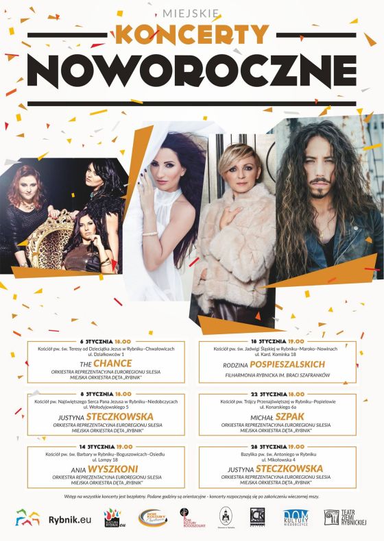 Zapraszamy na noworoczne kolędowanie z gwiazdami! Z rybnickimi muzykami wystąpią: The Chance, Ania Wyszkoni, Michał Szpak, Rodzina Pospieszalskich i Justyna Steczkowska.