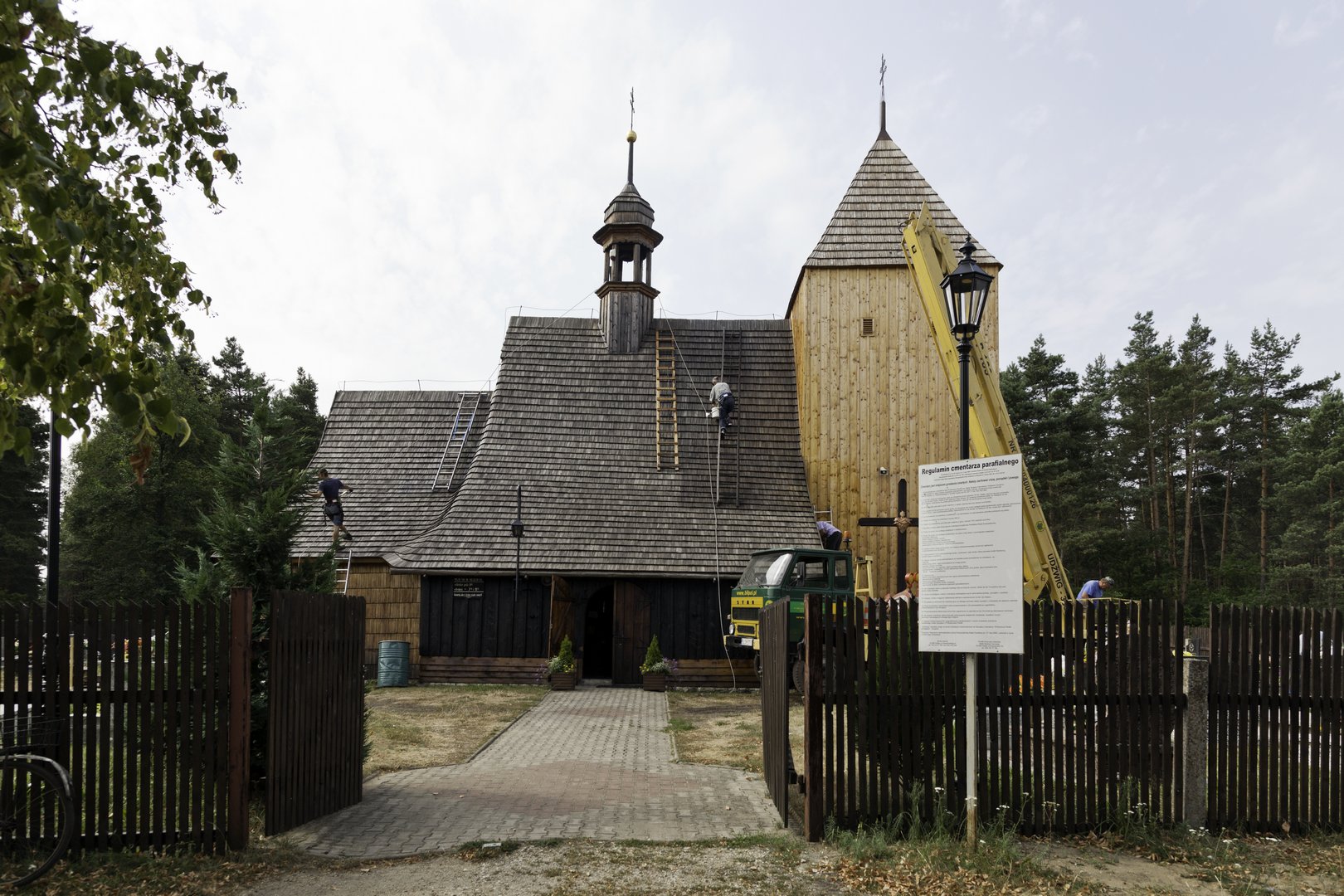 Orientowany kościół pw. św. Jana Chrzciciela posiada konstrukcję zrębową. Wieża, o konstrukcji słupowej, znajduje się w zachodniej części świątyni. Nawa na planie zbliżonym do kwadratu, posiadająca przedsionek, łączy się z krótkim prezbiterium, zamkniętym ścianą prostą. Przy nim znajduje się mała zakrystia. Niewielki chór muzyczny z organami wsparty jest na dwóch drewnianych słupach. Dwuspadowe dachy pokryte są gontem. Nad nawą wznosi się sygnaturka z baniastą kopułką. Wieża nakryta jest dachem namiotowym.