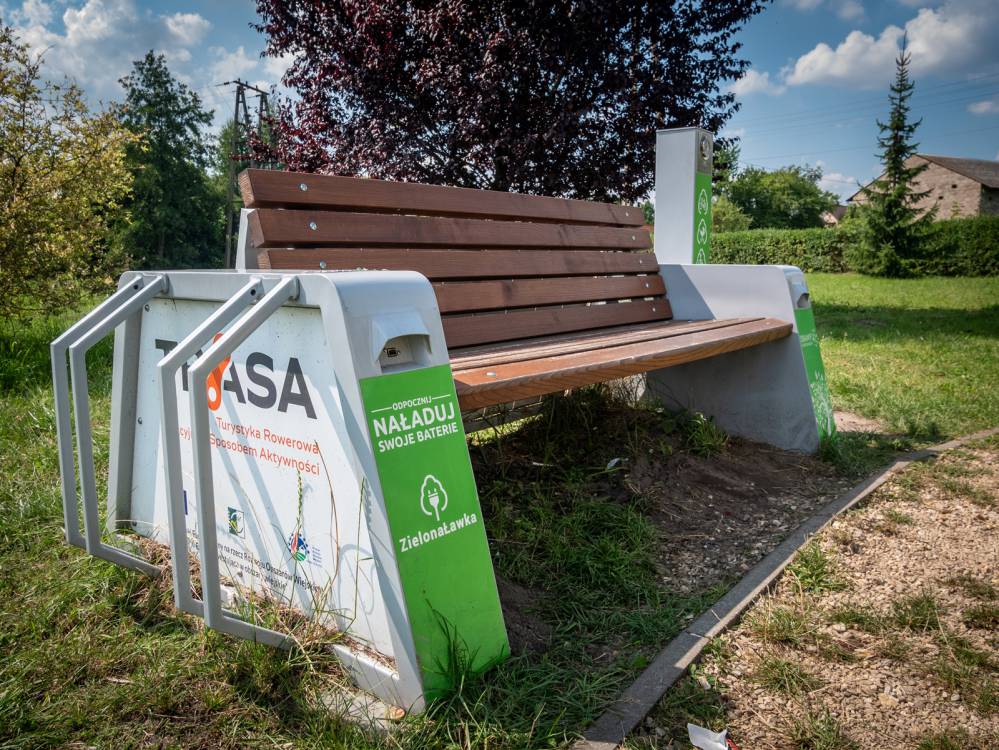 Folga na zakolu - czerwony, ławka solarna przy MORze w Kruszynie, Damian Berłowski - roweremposlasku.pl