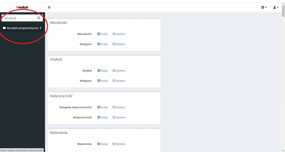 1. Wybierz w pasku menu opcję "Narzędzia programistyczne", wpisując w wyszukiwarkę słowo "narzędzia".