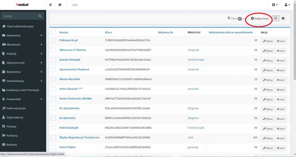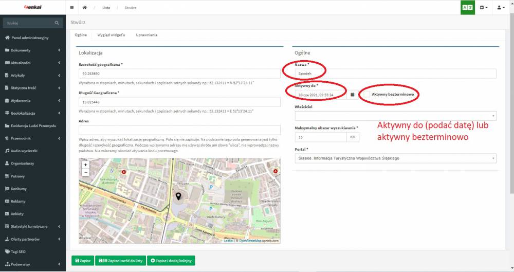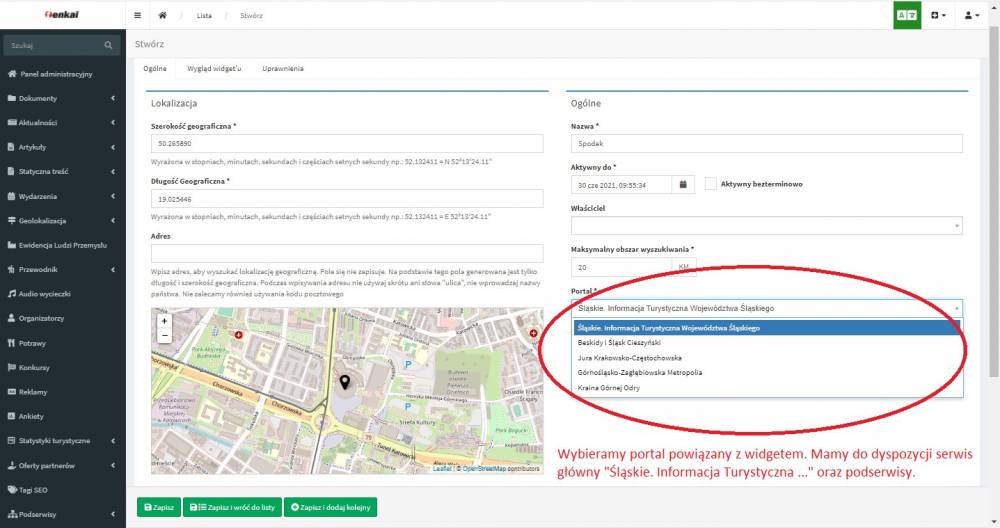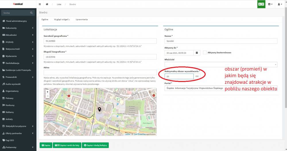 5, 6 i 7. Wprowadź nazwę, datę ważności widgetu oraz maksymalny obszar wyszukiwania obiektów / atrakcji umieszczonych w Twoim widgetcie (patrz następne kroki). Zaznacz także serwis (portal), który chcesz aby się wyświetlał w widgetcie. Masz do wyboru serwis główny "Śląskie. Informacja Turystyczna Województwa Śląskiego" oraz podserwisy subregionalne: Beskidy i Śląsk Cieszyński, Jura Krakowsko-Częstochowska, Górnośląsko-Zagłębiowska Metropolia oraz Kraina Górnej Odry.