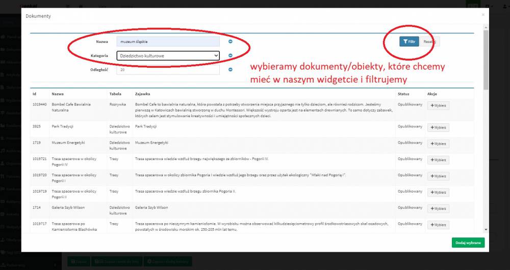 10 i 11. W wyszukiwarce „Kategoria” wybierz interesujące Cię rodzaje obiektów/atrakcji, które chcesz zamieścić na widgetcie. Zaznacz opcję „filtr”. Pokażą się dokumenty z danej kategorii, które możesz zamieścić na swoim widgetcie.