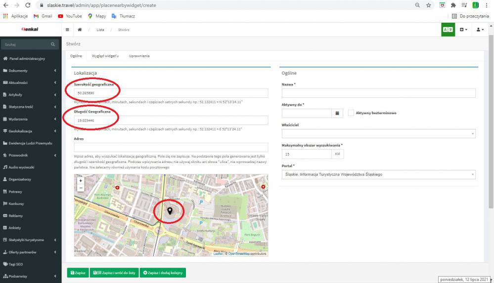 4. W nowym widgetcie, w zakładce „Ogólne” określ lokalizację za pomocą mapki, zaznacz pinezką Twoją lokalizację lub wpisz koordynaty (współrzędne) GPS.