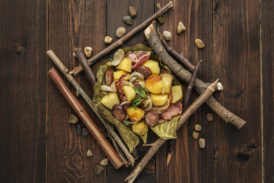 Żółte ziemniaki, biała cebula, brązowa kiełbasa, brązowo-biały boczek, zielona kapusta
